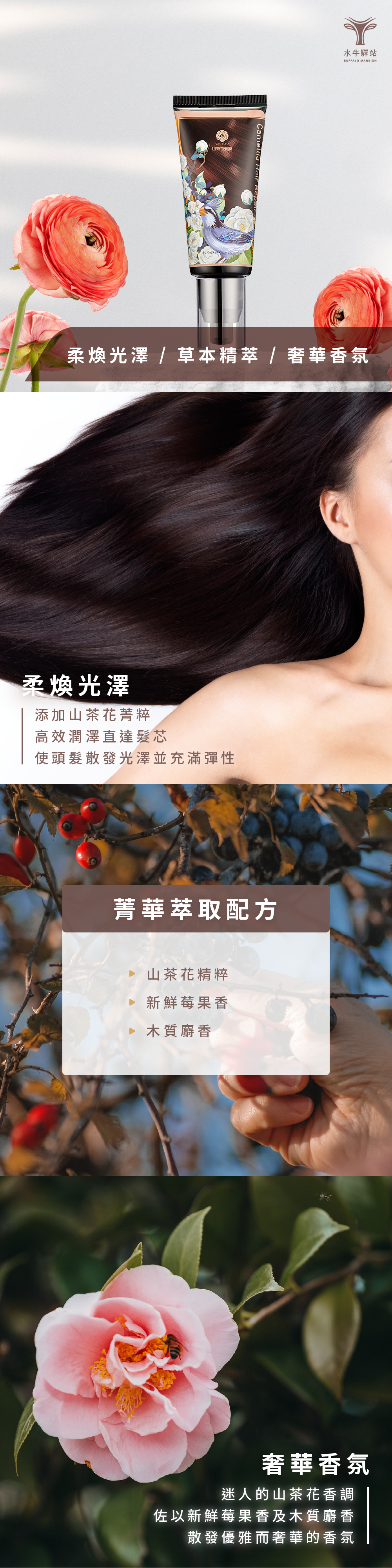 添加山茶花菁粹高效潤澤直達髮芯,使頭髮散發光澤並充滿彈性。