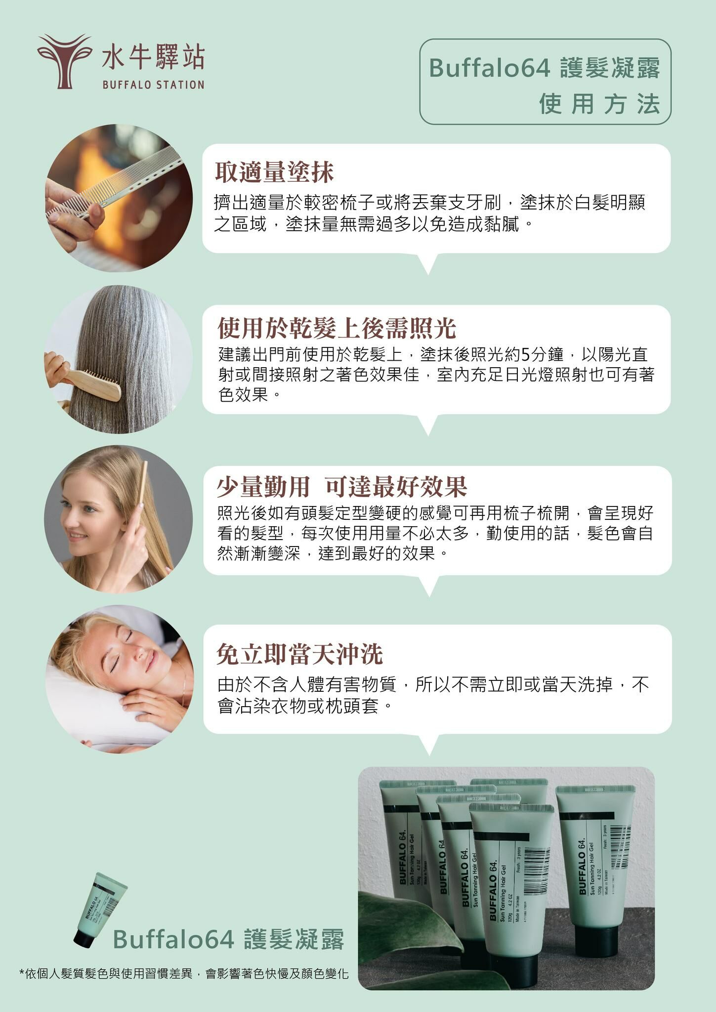 添加高山茶 (Camellia Sinensis Leaf)、銀離子以及天然何首烏萃取等精萃成份,簡單塗抹速效遮蓋髮根白髮。